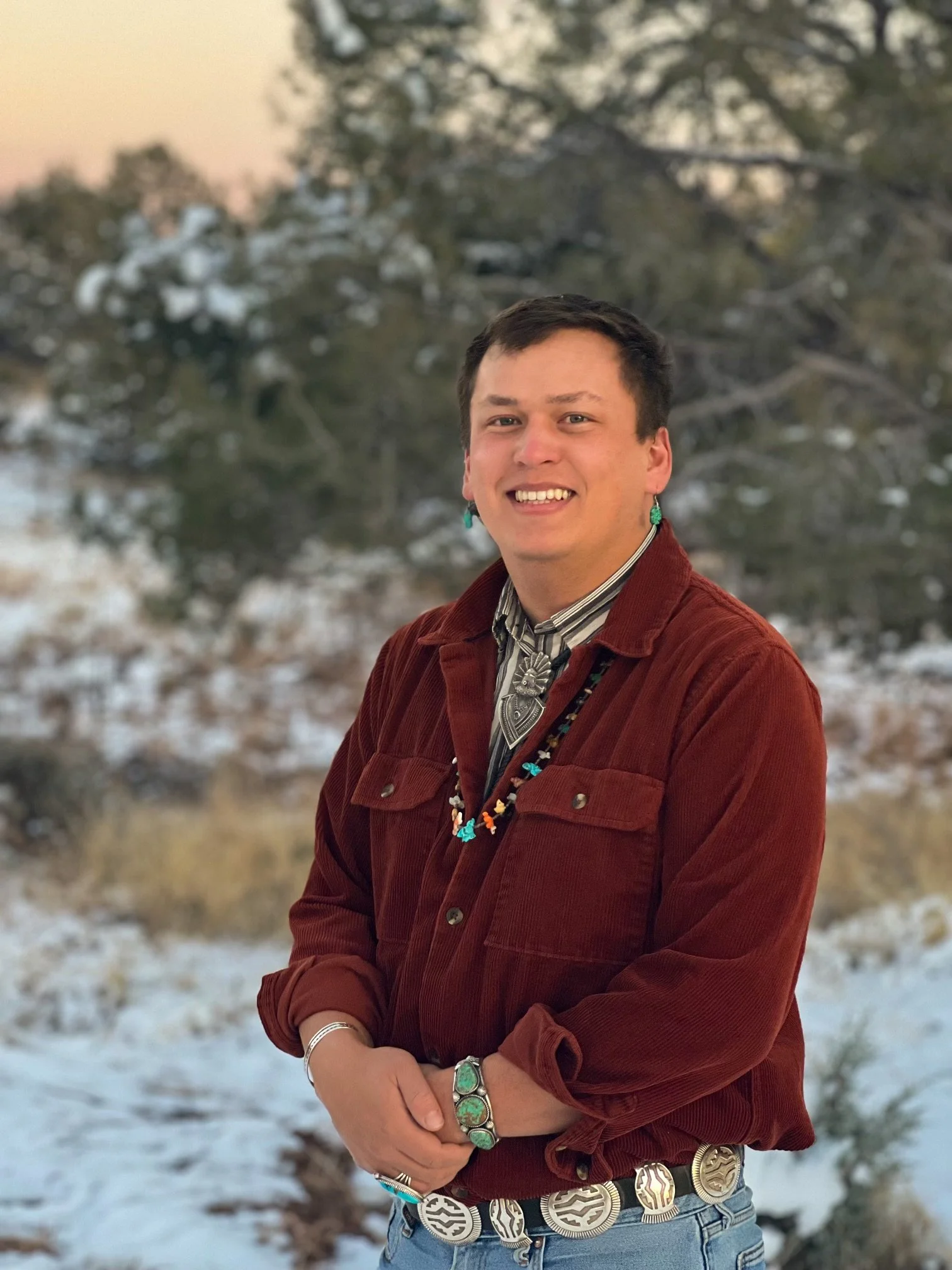 Yá’át’ééh. David Delmar is Kin Łichíi’nii and born for Tó Dích’íi’nii. His maternal grandfathers are Naneesht’ézhí Tóbąąhí and paternal grandfathers are Táchii’nii. He is originally from Ak’ih Dah Nást’ání in the northwestern part of the Diné Nation in northern Arizona.